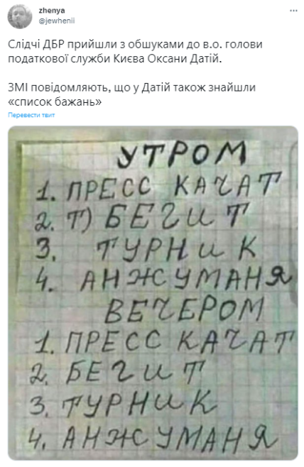 Стоит отметить, что в 2021 году она стала замом начальника отдела анализа налоговой информации управления специального аудита ГУ ГНС в Киеве, а уже в 2022 ее желание, отмеченное в списке, сбылось — Датий назначили и.о. начальника ГНС столицы.
