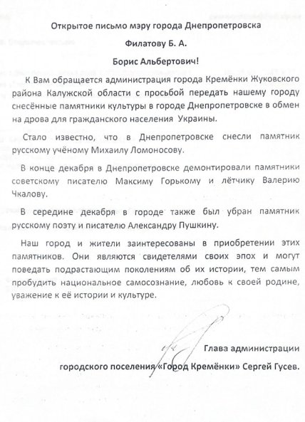 В обращении к "мэру Днепропетровска" сказано, что жители поселка Кременки Жуковского района Калужской области россии крайне раздосадованы снесением памятников ученому Михаилу Ломоносову, писателю Максиму Горькому, летчику Валерию Чкалову и поэту Александру Пушкину. Власти российской глубинки заявили, что хотят выкупить у Украины эти памятники для "национального самосознания подрастающего поколения". В качестве валюты предложили не рубли и даже не газ, а дрова.
