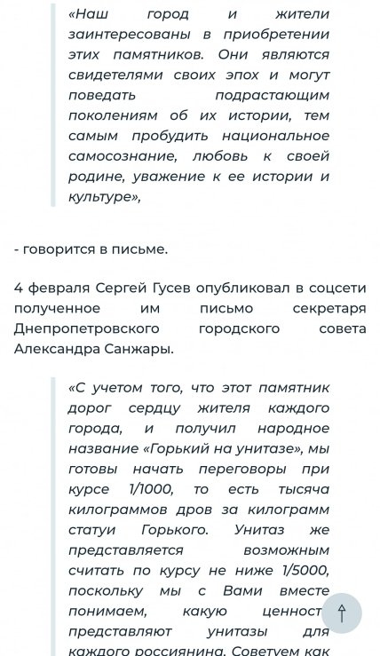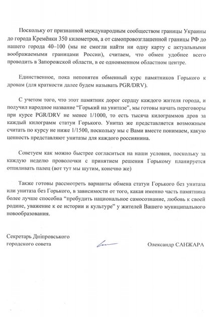 "С учетом того, что этот памятник дорог сердцу каждого жителя города, и получил народное название "Горький на унитазе", мы готовы начать переговоры при курсе не менее 1/1000, то есть тысяча килограммов дров за каждый килограмм статуи Горького. Унитаз же представляется возможным считать по курсу не ниже 1/1500, поскольку мы с Вами вместе понимаем, какую ценность представляют унитазы для каждого россиянина… Также готовы рассмотреть варианты обмена статуи Горького без унитаза или унитаза без Горького, в зависимости от того, какая именно часть памятника лучше способна "пробудить национальное самосознание, любовь к своей родине, уважение к ее истории и культуре" у жителей Вашего муниципального новообразования", — написали в горсовете.