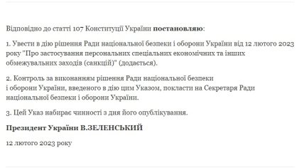 Так, согласно документу, 12 февраля Владимир Зеленский постановил ввести решение Совета национальной безопасности и обороны Украины "О применении персональных специальных экономических и других ограничительных мер (санкций)". Контроль за исполнением решения СНБО возложен на секретаря Алексея Данилова. Кроме того, СНБО, СБУ и Кабмин поручили мониторить эффективность персональных санкций, а МИД — проинформировать компетентные органы ЕС и США.