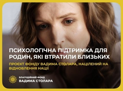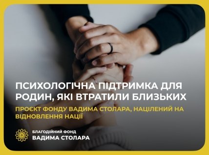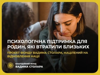 Осенью 2022 года стартовал проект Благотворительного фонда Вадима Столара "Психологическая поддержка", призванный помочь семьям, потерявшим близких. Инициатива преследует цель восстановления украинской нации, говорится в сообщении на сайте Фонда.