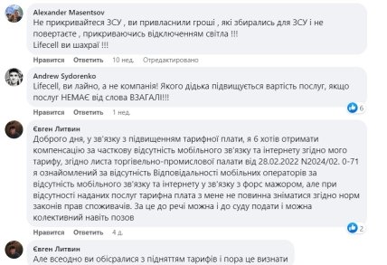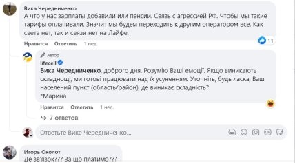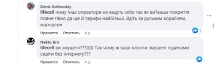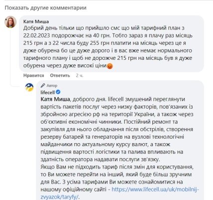 "Постоянный ремонт и закупка для него оборудования после обстрелов, создание резерва батарей и генераторов на узловые технологические площадки по актуальному курсу валют, а также повышение стоимости логистики и топлива влияют на способность оператора предоставлять услуги связи", — говорится в ответе менеджера Lifecell Facebook-странице оператора.