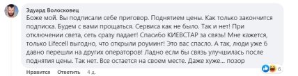 "У лайфцелла даже 3G подыхает через 10 минут после отключения (и это в центральных районах Киева!!!). В спальных связи тупо нет. Жлобы. Аккумы закупайте и ставьте, а потом цены поднимайте", "Где связь??? За что платим???", "Омерзительная связь", — не подбирают эпитетов потребители.