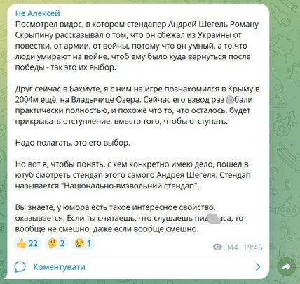 Отметим, что Андрей Щегель является одним из ведущих украинских стендап-комиков, участвовал в протестах в Беларуси в 2020 году, затем вернулся в Украину. Называл свое шоу национально-освободительным стендапом.