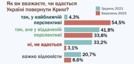 В марте 2023 года более половины наших граждан убеждены, что в ближайшей перспективе Украина сможет освободить Крым, временно оккупированный российскими войсками, хотя в декабре 2021-го, до начала полномасштабной войны с РФ, так считали немногим более 4 процентов опрошенных.