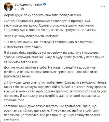 "Сегодня произошло дорожно-транспортное происшествие, которое закончилось трагедией. Одним из участников этого ужасного инцидента был я, другого врачи, к сожалению, спасти не смогли", — сообщил Гевко.