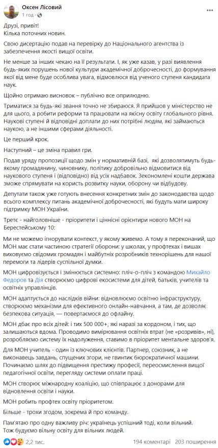 Об этом он написал на собственной Facebook-странице. По словам Лисового, в случае выявления каких-либо нарушений норм академической добродетели, он собирается отказаться от имеющейся у него ученой степени "кандидат наук".
