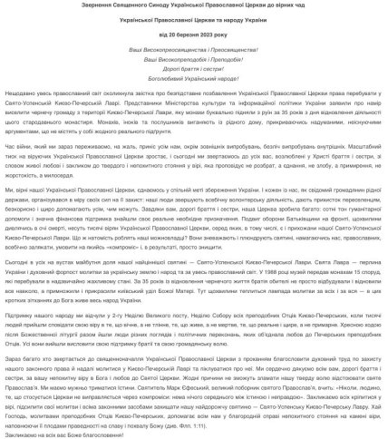"Сейчас многие обращаются к священноначалию Украинской Православной Церкви с просьбой благословить духовный труд по защите нашего законного права и в дальнейшем молиться в Киево-Печерской лавре и заботиться о ней. Мы сердечно благодарим всех вас, дорогие братья и сестры, за вашу непоколебимую веру в Бога и любовь к Святой Церкви. Никакие причины не смогут сломить нашу жесткую волю отстаивать святое Православие", — заявляет Синод УПЦ.