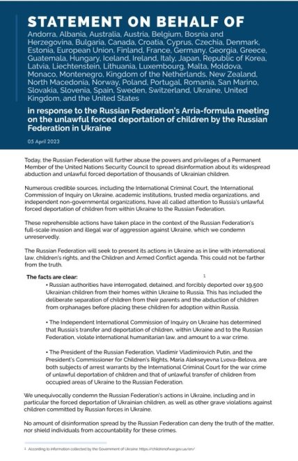 "рф злоупотребляет правами и привилегиями постоянного члена Совбеза ООН с целью распространения дезинформации относительно организованных ею похищений и незаконных принудительных депортаций тысяч украинских детей", — говорится в тексте совместного заявления.