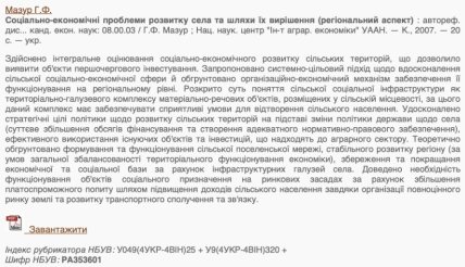 На сайте Национальной библиотеки Украины им. Вернадского удалось найти и скачать текст автореферата Мазура Г.Ф. к его диссертации "Социально-экономические проблемы развития села и пути их решения (региональный аспект)".