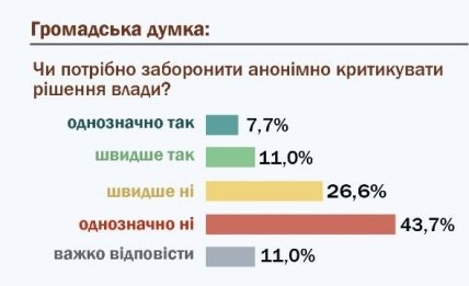 На вопрос анкеты "Нужно ли запретить анонимно критиковать решение властей?" утвердительно ответили 7,7% респондентов; ответили скорее да — 11,0%; скорее нет — 26,6%; однозначно нет — 43,7%; затруднились с ответом — 11% опрошенных.