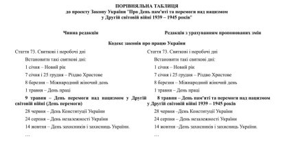 Так, в данном законопроекте президент предлагает отменить День победы, который ранее ежегодно отмечался 9 мая. Вместо этого он хочет, чтобы в Украине появится новый праздник — День памяти и победы над нацизмом во Второй мировой войне 1939-1945 годов. Он будет отмечаться 8 мая и будет выходным днем.