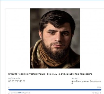 "Считаю, что имя Дмитрия Коцюбайло должно быть обязательно увековечено в городском пространстве Киева. Предлагаю создать улицу Дмитрия Коцюбайло в Печерском районе города Киева вместо улицы Неманской", — пишет Роговцева.
