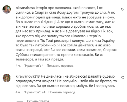 "Хуже сделать, чем сделал печально известный Спартак Суббота, смогла Наталья Мосейчук, которая взялась его отбеливать. Всегда удивлялся желанию журналистов погружать руки по локти в разное де*ьмо. Хотя некоторые – уже там просто плавают… Но хорошо, что люди у нас все же умнее и не воспринимаю все эти манипуляции", – такое мнение выразил Facebook Игорь Тихолаз.