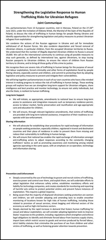 "Четкие месседжи осуждения преступлений рф против украинских детей были включены в коммюнике по моему предложению, как соорганизатор и спикер мероприятия, состоявшийся в Сейме Польши. Спасибо всем участникам и соавторам документа за солидарность и вклад в борьбу за восстановление прав депортированных украинских детей", — подчеркнула Елена Кондратюк.