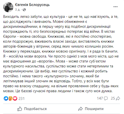 Пока в Киевсовете не решаются раскрыть подробности собственного решения, украинцы делают выводы исходя из обнародованной информации и, следует отметить, против подобных ограничений выступают не только "агенты фсб". Так, в день принятия "языкового моратория" украинская писательница Евгения Белорусец опубликовала на своей странице в Facebook сообщение о дискриминационной практике языковых ограничений.