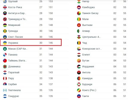 Так, граждане Украины могут посещать без виз 146 стран в мире, включая Джибути, Израиль и Суринам. 30-е место в рейтинге Украина разделяет с такими государствами, как Гренада и Сент-Люсия.