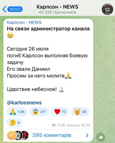 Так украинский блогер Денис Казанский сообщил, что в ходе боевых действий был ликвидирован оккупант по имени Даниил, который вел телеграм-канал Карлсон-News.