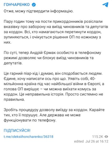 "По сути теперь Андрей Ермак лично в телефонном режиме разрешает или блокирует выезд чиновников и депутатов. Это хороший пиар-ход и думаю, он понравится людям. Единственное, хочу написать вот о чем. Представьте себе, 40-миллионная страна во время самой большой войны в Европе, а глава ОП решает – можно ли уехать кому-то за границу. Это неправильная история. Просто системно не верна", — сказал он.