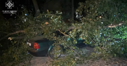 Подобная ситуация случилась на улице Софии Ковалевской Амур-Нижнеднепровского района города Днепр. Дерево рухнуло на легковой автомобиль Renault Kangoo и электропровода.