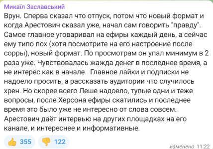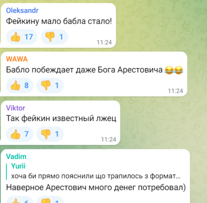 "Все, что вы видели, какие-то наветы на меня, фейки и так далее – конечно же, ложь, и я вам скажу почему. У меня есть переписка. Вы с кем имеете дело? С адвокатом! С блестящим адвокатом. Несмотря на то, что меня лишили этого статуса…", — сказал он, имея в виду информацию в сети о якобы страйках с его стороны на канал Арестовича.