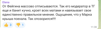 "Над Фейгиным никогда не будет никаких, бл…дь, начальников. Никто не будет мне указывать, как мне вести мой канал. А свои благодарности пусть свернут в трубочку и засунут в *опу", – высказался он.