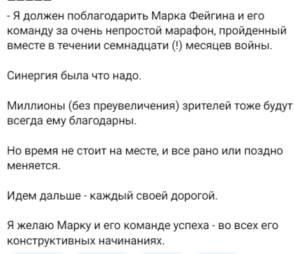 Стоит отметить, что ранее Алексей Арестович написал пост с благодарностью Фейгину за пройденный вместе путь.