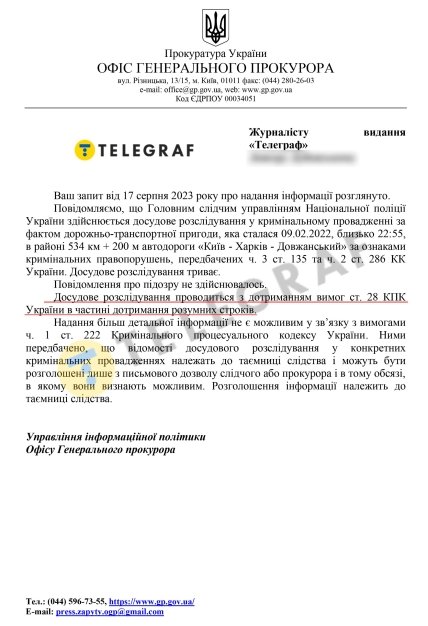 Также в прокуратуре добавили, что предоставление более детальной информации относительно этого ДТП невозможно в связи с требованиями ч. 1 ст. 222 Уголовного процессуального кодекса Украины: "Ими предусмотрено, что сведения досудебного расследования в конкретных уголовных производствах относятся к тайне следствия и могут быть разглашены только с письменного разрешения следователя или прокурора и в том объеме, в котором они признают возможным. Разглашение информации относится к тайне следствия".