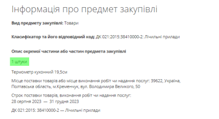 О неудавшейся закупке стало известно из данных на сайте Рrozorro. Победитель тендера на покупку одного кухонного термометра для кременчугского детского сада №63 (местный предприниматель Андрей Черноиван) указал его цену — 384 100 002 гривен.