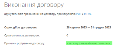 На сайте Рrozorro отмечается, что договор был расторгнут. Указанная причина — "в связи с механической ошибкой".