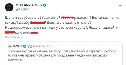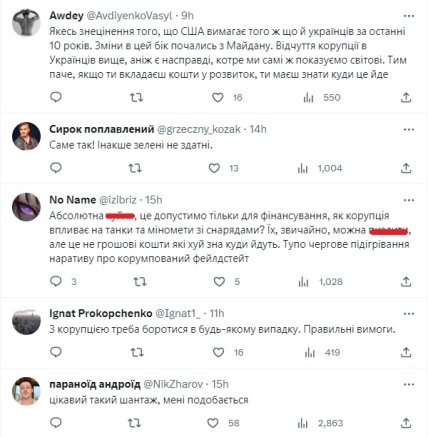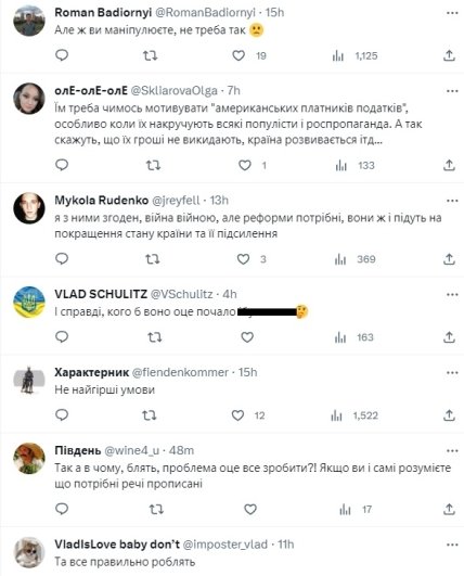 Стоит отметить, что данная новость вызвала бурную волну обсуждений в украинском обществе. Некоторые наши сограждане откровенно возмущались "требованиям" сша. Хотя некоторые предположили, что волнай хейта могла пойти из-за недопонимания. Они отметили, что часть общества могла воспринять документы, как требования из-за неверного истолкования в СМИ. Дело в том, что часть медиа написала о данных документах, как о "требованиях США для продолжения предоставления военной помощи". Хотя в посольстве США в Украине, публикуя свое сообщение, прямо указали, что документы являются "предложением Украине приоритетных реформ для обсуждения и обратной связи".