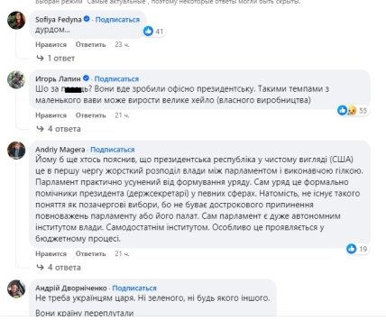 "Украина – демократическая парламентско-президентская республика. И только так. Смена устройства приведет к внутренней дестабилизации и иначе. Янукович тоже так хотел поступить. Лучше тестируйте РЭБы для фронта, а не автократические модели", — считает он.