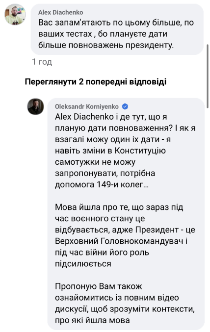 Отметим, что после возникновения резонанса вокруг своих слов Корниенко решил объяснится. Он заявил, что речь шла о том, что сейчас во время военного положения это происходит, ведь президент – это Верховный Главнокомандующий и во время войны его роль усиливается.