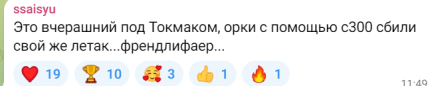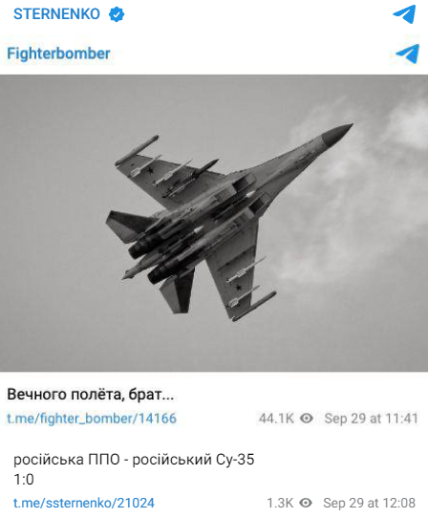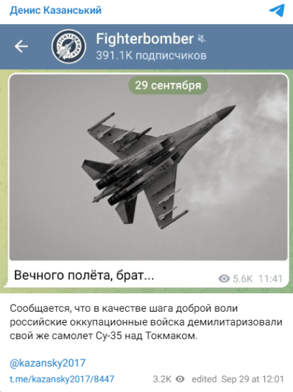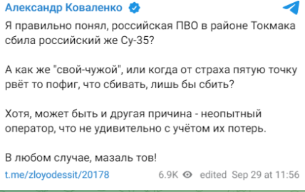 Отмечается, что в ночь на 29 сентября над Токмаком был запуск из системы С-300 в режиме ПВО. Таким образом россияне сбили собственный самолет Су-35. Исходя из сообщений в сети, ликвидирована была не только очередная единица техники захватчиков, но и сам пилот.
