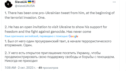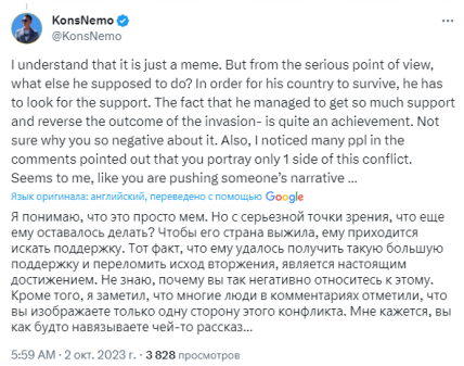 Так, в понедельник,2 октября, Илон Маск опубликовал пост в соцсети Х (бывш. Twitter), в котором он разместил, видимо, смешной по его мнению мем. На нем грустное лицо Зеленского и следующая подпись: