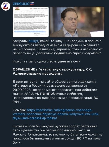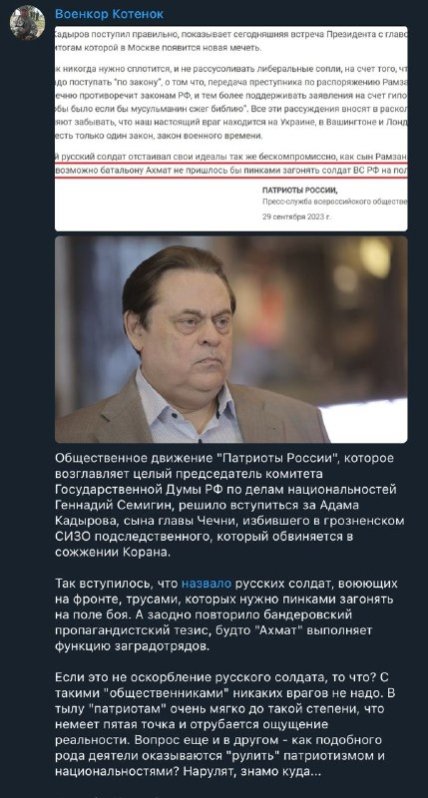 Российский депутат и лидер движения "Патриоты россии" геннадий семигин буквально признал, что кадыровцы на фронте используются в качестве заградотрядов для российских оккупантов, которые пытаются разбегаться на поле боя. Россияне уже успели выразить недовольство его заявлениями.