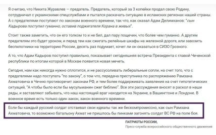 "Если бы каждый солдат отстаивал свои идеалы также бескомпромиссно, как сын рамзана ахматовича (кадырова, — Ред.), то, возможно, батальону Ахмат не пришлось бы пинками разгонять солдат рф на поле боя", — сказал семигин.