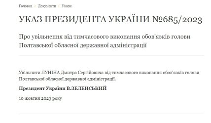Соответствующий указ появился на сайте главы государства. Чиновника назначили вместо предыдущего руководителя ОВА Дмитрия Лунина. Его освободили от временного исполнения обязанностей также 10 октября.