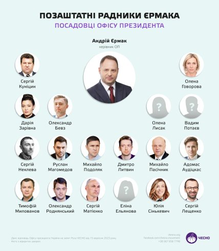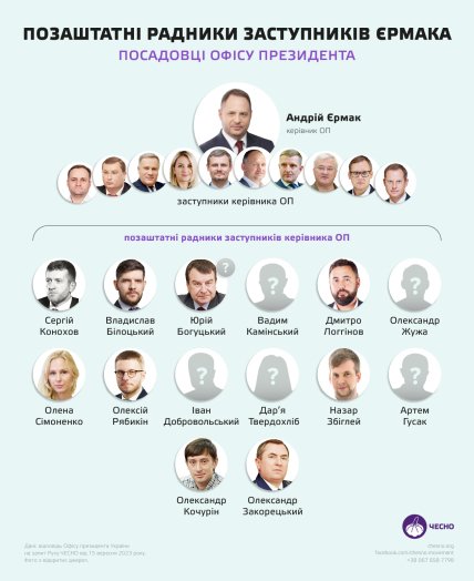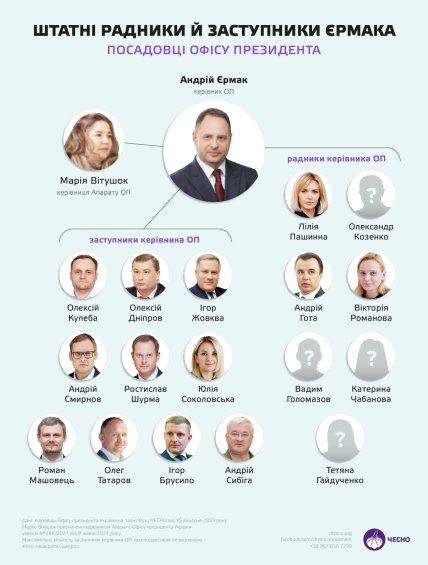 По актуальным данным, которые Движение ЧЕСТНО получило от Офиса президента, по состоянию на начало октября 2023 года в подчинении Андрея Ермака есть 58 человек — 10 заместителей, 7 советников, 18 советников вне штата, еще 14 советников его заместителей, советников самого Офиса президента и руководитель Аппарата. В то же время максимальное количество заместителей руководителя ОП законодательством не определено.