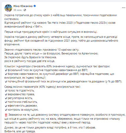 Отметим, рейтинг прокомментировала член Комитет Рады по финансам, налоговой и таможенной политике Нина Южанина. На своей странице в Facebook она написала пост, в котором отметила, что учитывая, что довоенную систему налогообложения вернули, место в этом рейтинге, к сожалению, может остаться за Украиной, если даже страна не займе первое. По мнению Южаниной, "благодарить" за єто нужно власть и тех, кто ее выбирал.