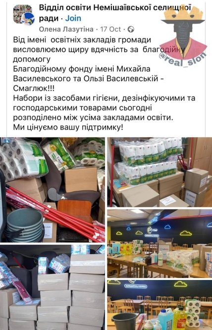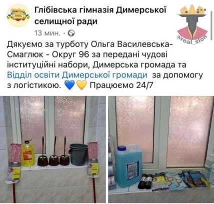 Как сообщает telegram-канал "Слон", Глебовская гимназия Дымерского поселкового совета получила от нардепа 3 туалетных ершика, 2 швабры, 2 ведра и жидкое мыло. Следует отметить, что позже со страницы учебного заведения пост о получении этой помощи был удален.