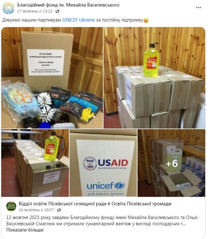 Также отмечается, что на странице фонда еще несколько фото того же инвентаря, который раздают с сентября. "Похоже, тогда и пришли гигиенические наборы от западных организаций, раздачу которых наши политики растягивают на месяцы пиара", — подчеркнули авторы канала.
