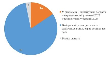 Об этом свидетельствуют результаты последнего опроса от КМИС. Так, по мнению 81 процента респондетов, которые были опрошены в период с 30 сентября по 13 октября, выборы должны проводиться после войны и сейчас они не ко времени. Еще 3 процента опрошенных не определились. И только 16 процентов украинцев думают, что они должны проводиться несмотря на войну.