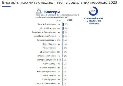 Украинцы ответили на вопрос кого именно из блогеров – общественных и политических деятелей, активистов, лидеров мнений – вы читаете/смотрите в социальных сетях чаще всего и на кого подписаны. Приводится сравнительная таблица ответа на этот вопрос в 2022 году и по состоянию на ноябрь 2023-го. Сейчас лидирует активист Сергей Стерненко, который нарастил аудиторию с 4 до 7 процентов.