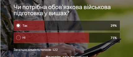 В то же время на сайте "Освіта" запустили опрос касательно того, нужна ли в украинских вузах обязательная военная подготовка. Большинство опрошенных граждан, а именно 71%, ответили негативно.