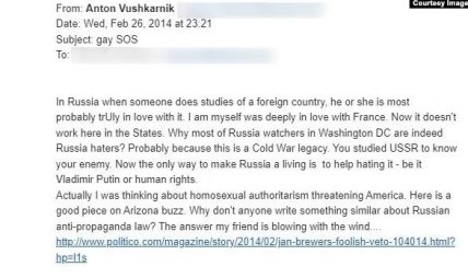 - По нему, например, у Радио Свобода есть электронное письмо, отправленное Вушкарником сотруднику Конгресса США со ссылкой на YouTube-видео, в котором украинские политики уподобляются нацистам. Также говорится, что Америке угрожает "гомосексуальный авторитаризм", при этом используется гомофобная лексика;
