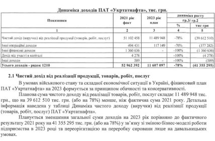 " При полученном фактическом доходе в 2021 г. в 52,96 миллиарда гривен, — продолжает Шнайдер, — Минобороны просит утвердить в представленном финплане на 2023 г. доходы "Укртатнафты" на уровне 11,49 млрд, что почти на 80% ниже чем в довоенном 2021-м, и при курсе доллара на 40% ниже, чем сейчас. Кстати, совокупный доход "Укрнафты" в 2021 г. составил 37 млрд грн, а вместе с 53 млрд "Укртатнафты" общий доход обоих предприятий составил 90 млрд грн. Почему эти цифры важны, потому что в финплане "Укрнафты" 2023 года правительством утвержден доход на уровне 94 млрд грн, которые должны создать иллюзию сверхчеловеческих менеджерских качеств Корецкого и его куратора Шурмы ".