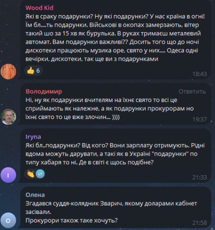Чтобы получить своеобразный срез мнений, "Телеграф" спросил своих читателей, считают ли они допустимым подобное поведение должностных лиц. По результатам голосования, в котором приняли участие более 700 подписчиков нашего Telegram-канала, 57% опрошенных выступают против того, чтобы работники прокуратуры принимали подарки во время войны, 7% не видят в этом ничего плохого, и еще 36% готовы разрешить чиновникам брать "презенты" только при условии, что все они будут переданы в пользу ВСУ с официальной отчетностью.