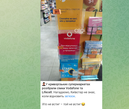 Поэтому некоторые абоненты атакованного оператора решили купить SIM-ки других операторов, по крайней мере, так выглядит ситуация в супермаркетах в Кривом Роге, пишет "Свои. Кривой Рог".