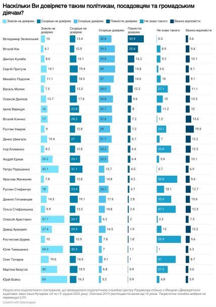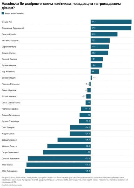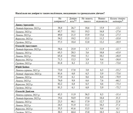 Большинство опрошенных не доверяют Ю. Тимошенко (85%), А. Арестовичу (82%), Ю. Бойко (81%), П. Порошенко (74%), М. Безуглой (58,5%), Д. Арахамии ( 57%), А. Ермаку (54%).